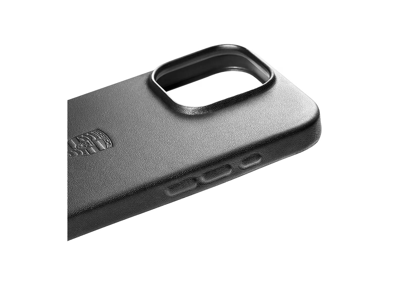 Stylish Porsche iPhone case in a modern, timeless design for the iPhone 16 Pro. The embossed Porsche Crest and 'Macan' lettering on the 100% cowhide leather surface gives the mobile phone case its unmistakable look.
