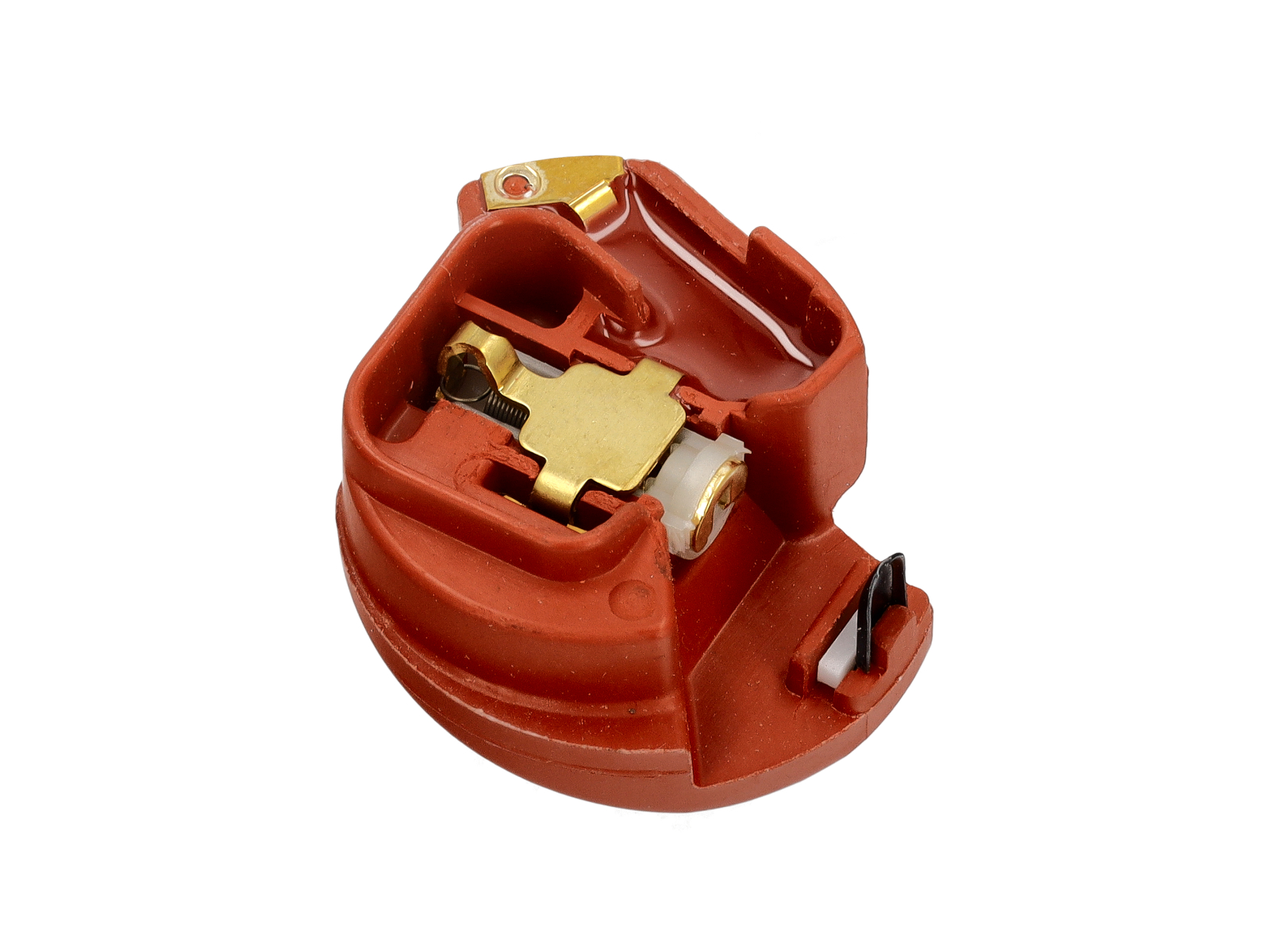 “转子”头连接在分电器轴的顶部,分电器轴由发动机凸轮轴上的齿轮驱动,从而与凸轮轴同步。该转子压在分电器盖中心端子上的碳刷上,该端子通过顶部端子直接连接到点火线圈(HEI系统),或者通过中心端子远程连接到点火线圈(触点式点火系统)。
