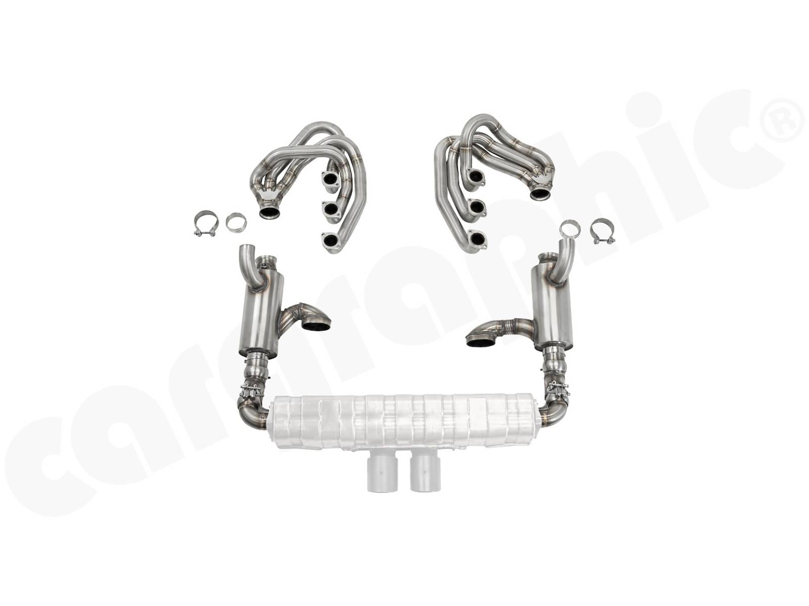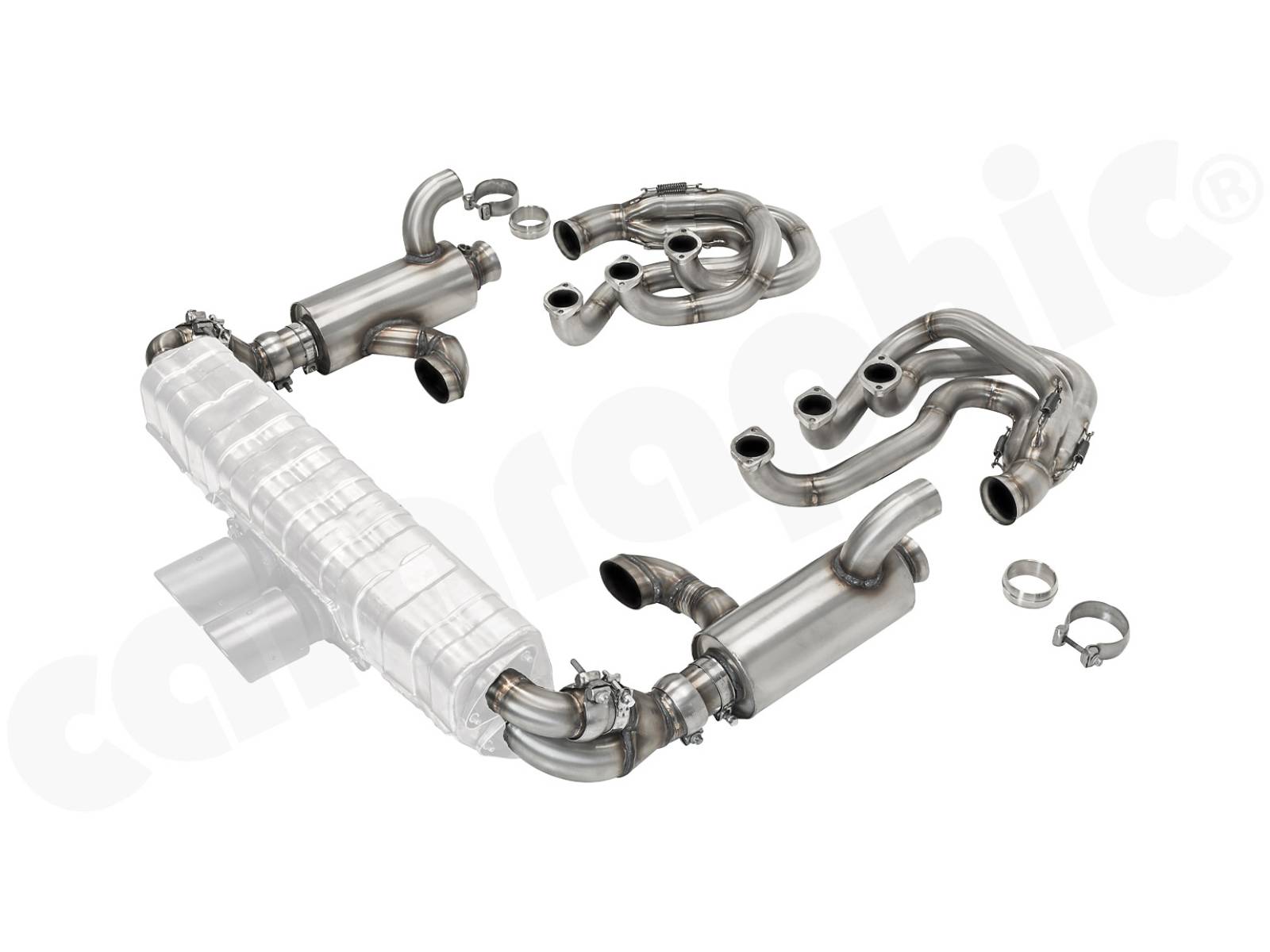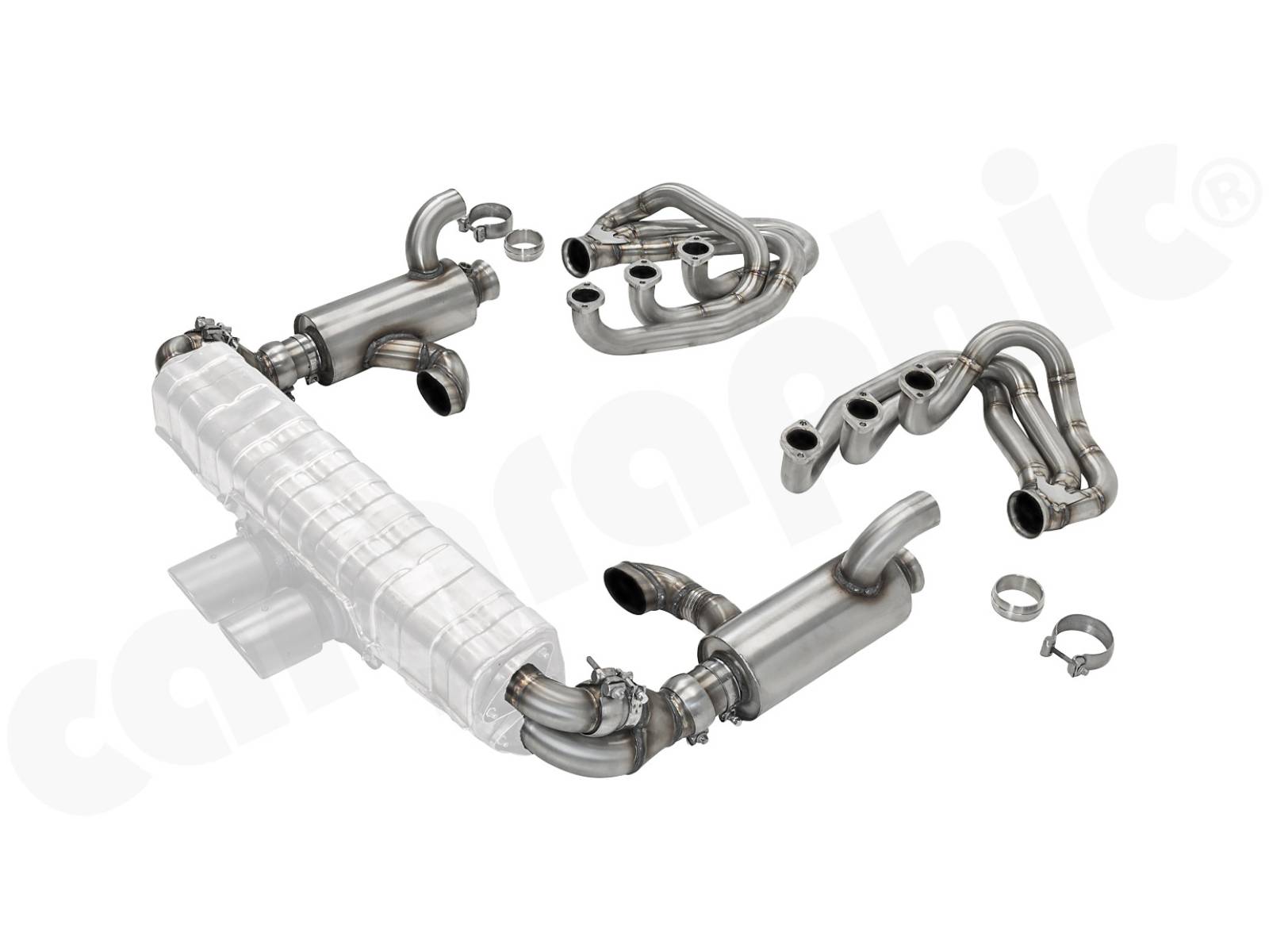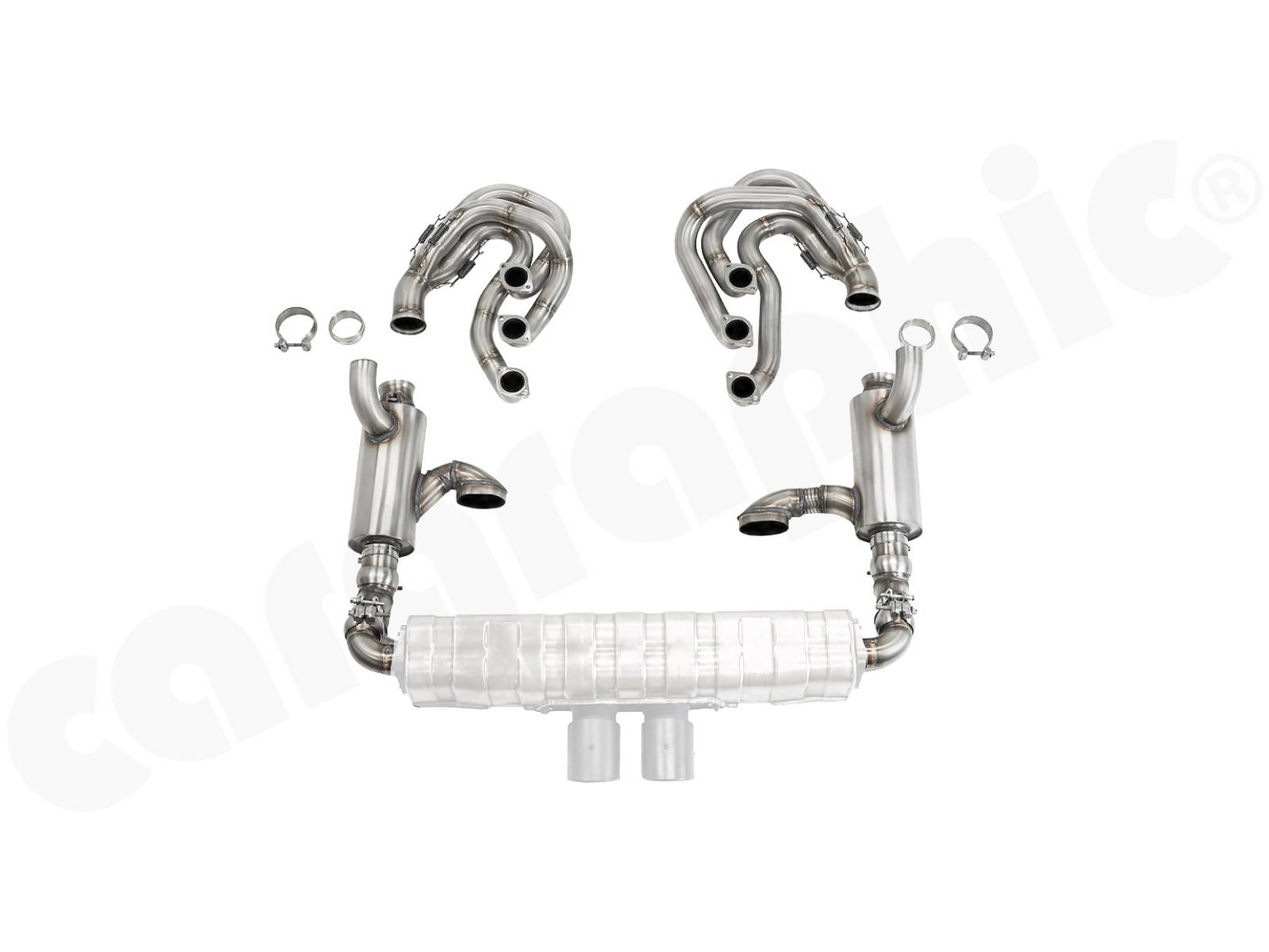 CARGRAPHIC GT Sport 排气系统,配备 ID42 GT 歧管套件,带/不带2x200cpsi 催化转化器,带加热功能,不带阀门,可与 OEM GT3 后消音器配合使用。