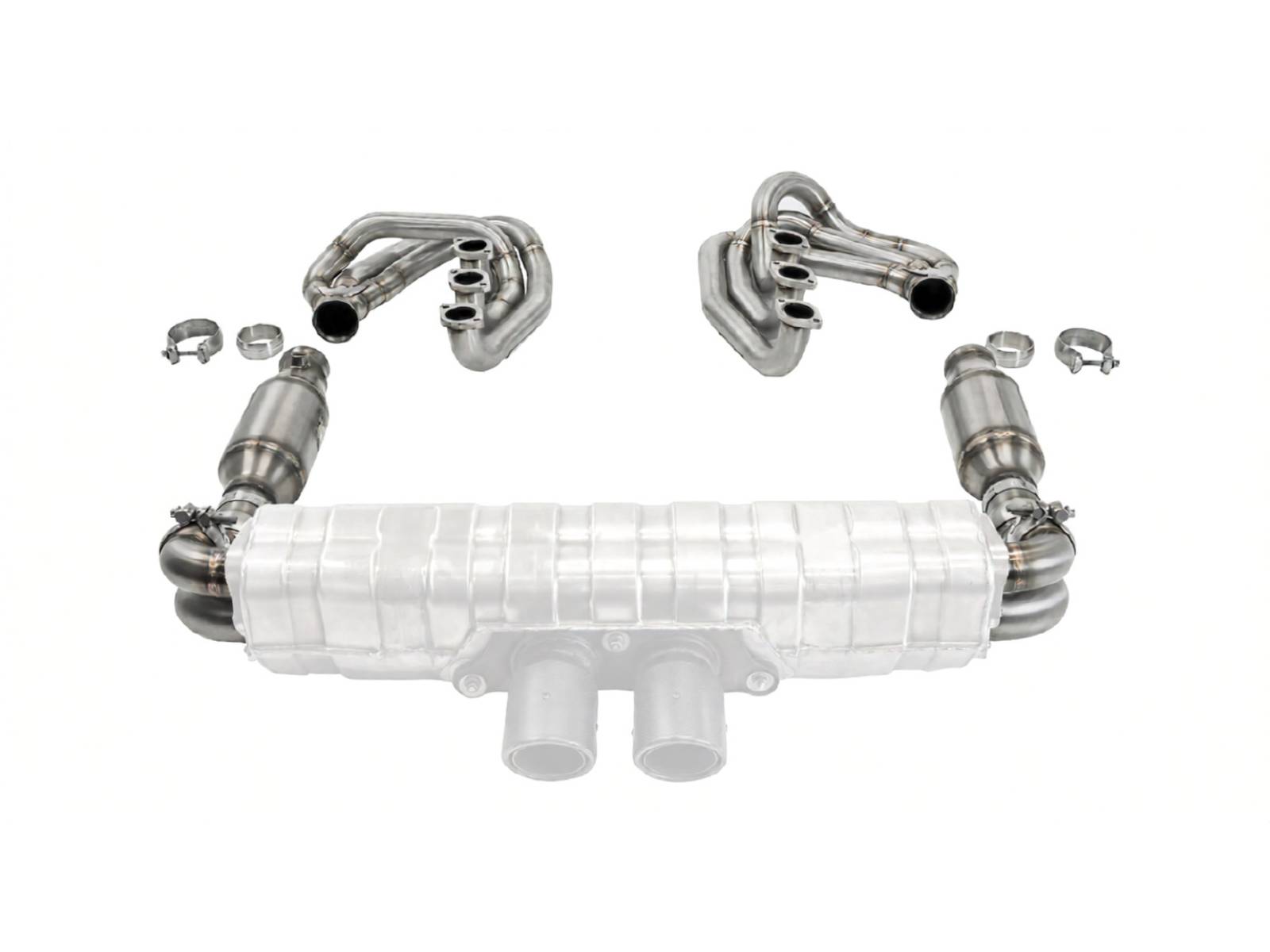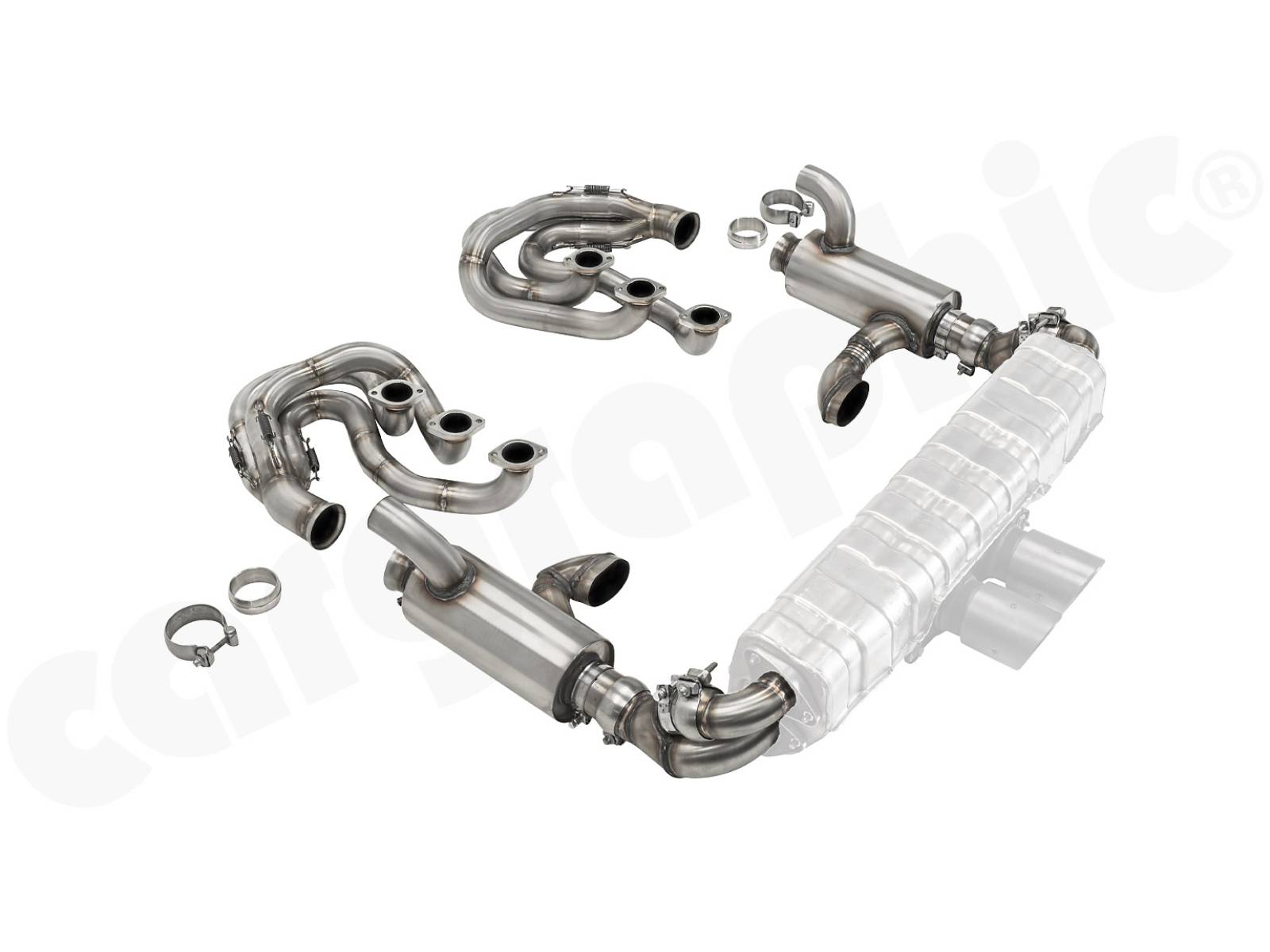 CARGRAPHIC GT Sport 排气系统,配备 ID45 GT 歧管套件,带/不带2x200cpsi 催化转化器,带加热功能,可与 OEM GT3 后消音器配合使用。